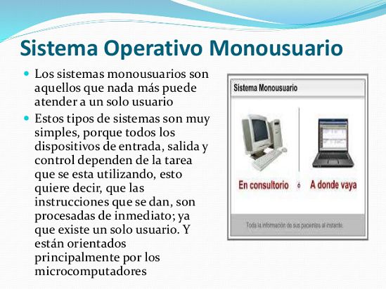 mientras que el sistema monousuario solo alberga a un usuario, en este tipo de sistema las taras son mas fáciles de ejecutar, ya que es una sola orden.