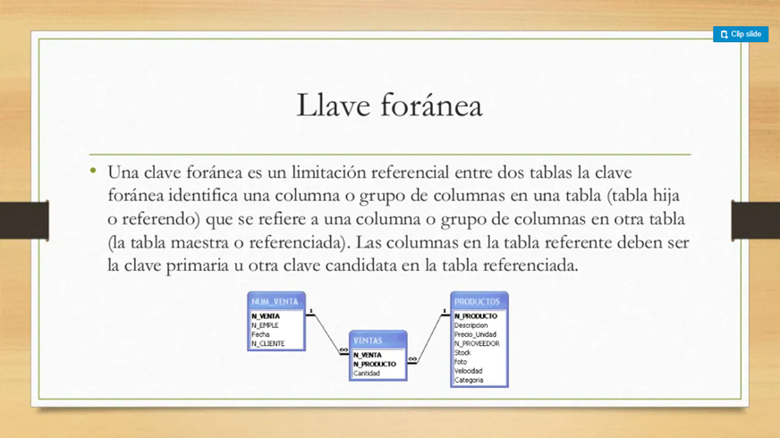Una clave foránea es un campo común y corriente que tiene la particularidad de corresponderse con la clave primaria de otra tabla, una columna en una tabla que contiene los mismos valores.