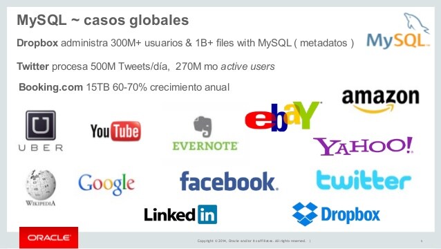 Hoy en día, MySQL es el RDBMS que está detrás de muchos de los principales sitios web del mundo y de innumerables aplicaciones corporativas y de consumo basadas en la web, como Facebook, Twitter y YouTube.